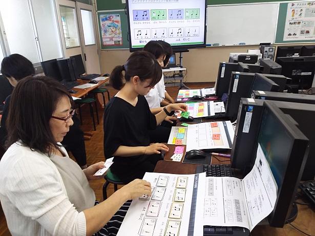 「プログラミング的思考」を学ぶために、リズムカードを使って、「おまつりの音楽」づくりの体験をしました。