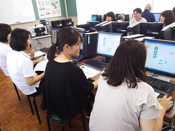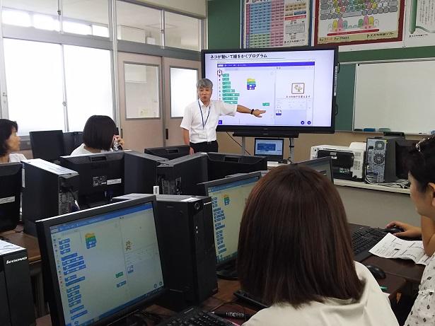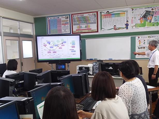 来年度から小学校でプログラミング教育が必修化されます。岡原小学校でも、そのための準備を進めているところです。8月19日(月)には、県立教育センター教育工学室室長の池田幸彦先生に来校いただき、「プログラミング教育」についての研修を深めました。