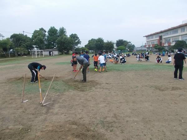 フィールド内に生い茂ってきた芝生を鍬で根こそぎ掘り起こします。力と根気のいる作業です。