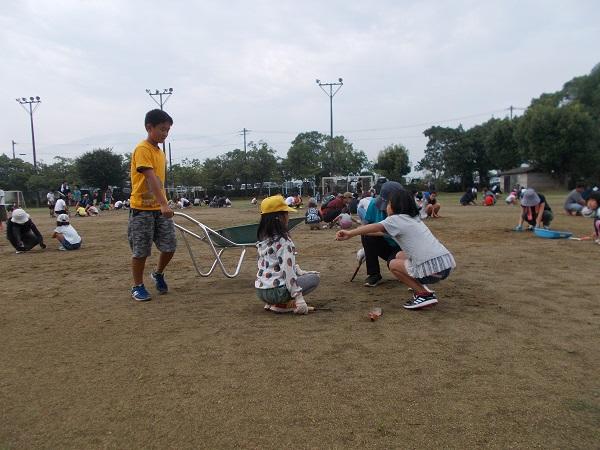 抜き取った草を一輪車で集めます。小学生もとてもがんばりました。