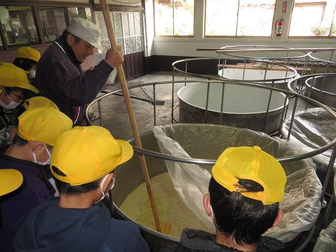 見学先は、学校近くの「堤酒造」。会社の方に案内と説明をしていただきました。