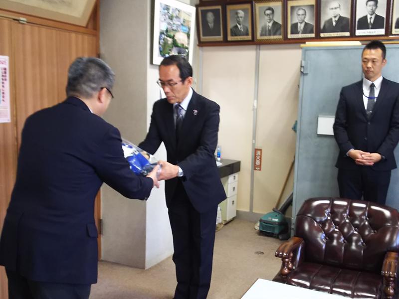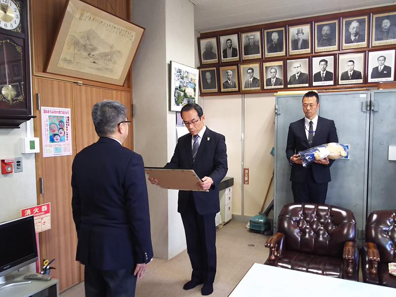 熊本県警察本部交通部長様から西浦校長へ感謝状授与の場面です。