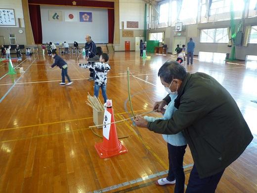 弓矢、初めての体験です。羽子板、お手玉、けん玉、竹とんぼ、こまも楽しみました。