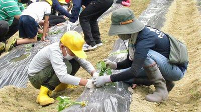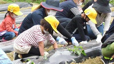 保護者の方々にご協力いただき、芋の苗植えを行いました。