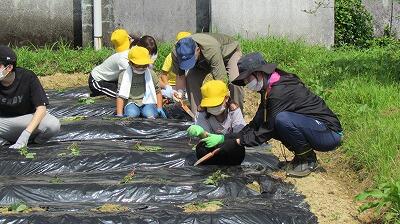 6月8日(水)の1時間目に1年生、2時間目に2年生が学校園でサツマイモを植えました。