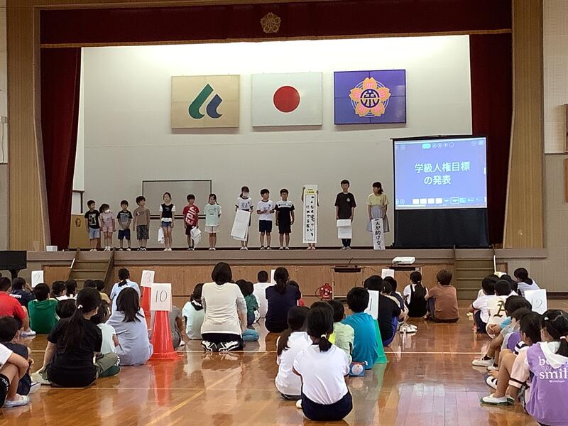 本校では、5月29日(月)~6月2日(金)を「人権週間」として、人権尊重の精神やいじめを許さない等の意識を高める「人権学習」を重点的に行いました。そのまとめとして、6月2日(金)に、全校児童による「人権集会」を行いました。