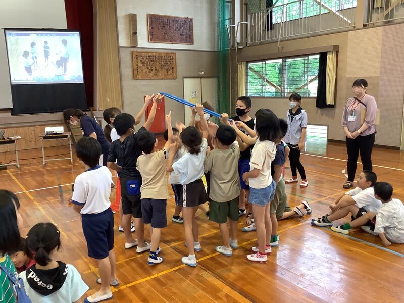 縦割り班による活動「ヘリウムリング」。みんなで協力して、フラフープを運びました。