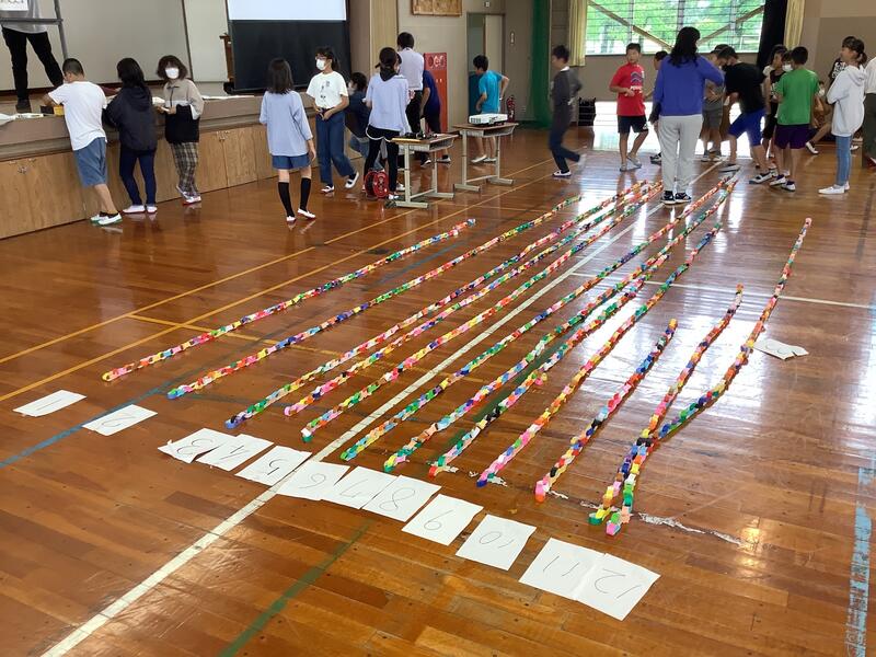 各班でつなぎ合わせた「輪飾り」を並べました。