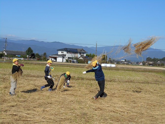 脱穀し終わった稲わらを、田んぼにばらまいて終わりです。