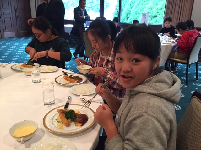 テーブルマナーを教えてもらって、緊張しながら食べてます。