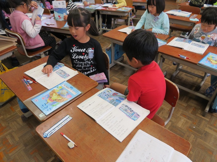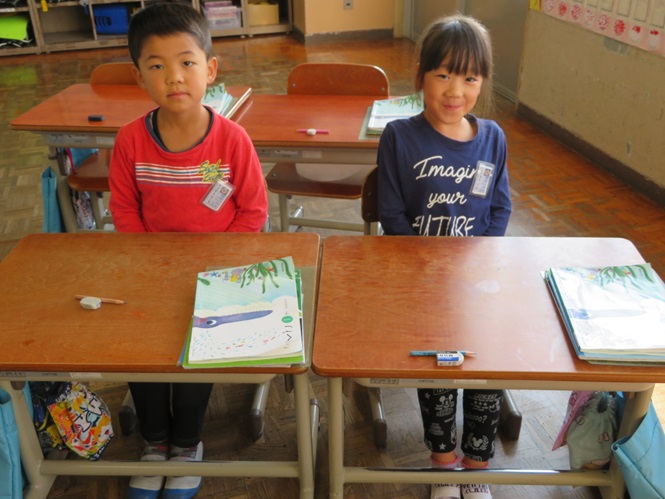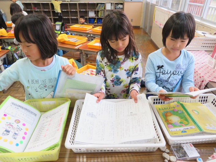 朝、登校したら、連絡帳や宿題を先生に提出します。自分たちでします。