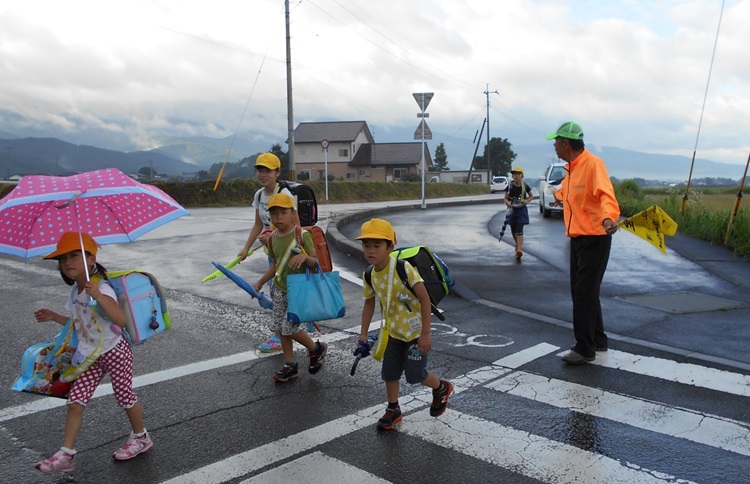 途中の横断歩道では、地域の方々がボランティアで安全見守りをしていただいています。