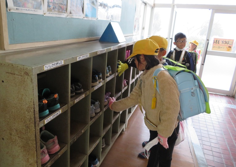 心の乱れは靴の乱れということで、児童は毎朝、登校したら、各学年の靴箱に靴をきれいに並べます。また、靴をきれいに並べるのは、災害発生時や緊急事態発生時に素早くかつ安全に対応するためでもあります。