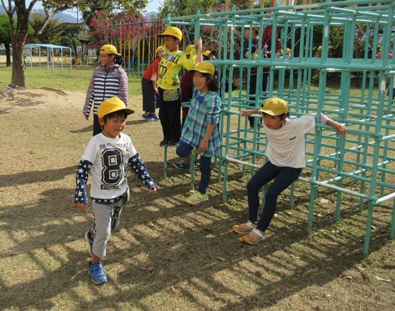 岡原小学校の運動場の一部は芝生になっていて、とても気持ちいい場所です。昼休み、天気のいい日にはみんな元気に外遊びです!「