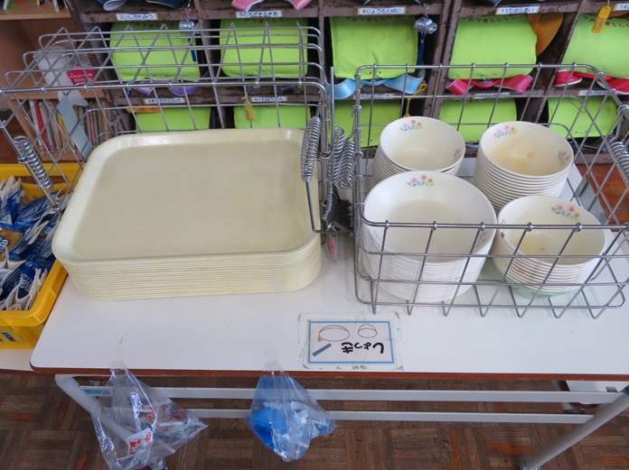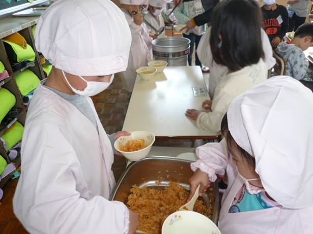 毎朝、配膳も自分たちでします。1年生もとても上手につぎ分けています。