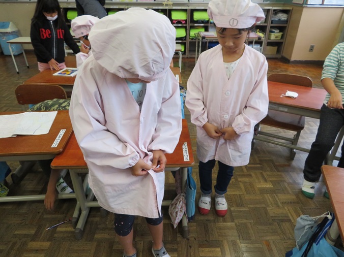 岡原小学校では、1年生から自分たちで給食の配膳をします。4時間目の授業が終わったら、当番の子たちは給食のエプロンに着替えます。