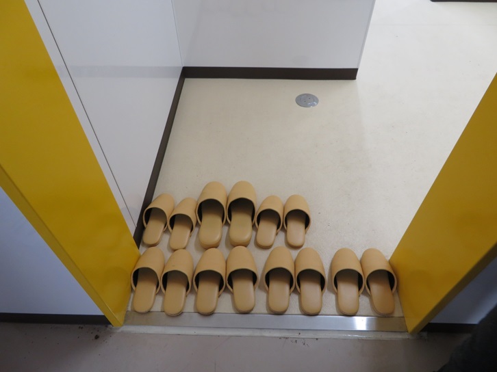 岡原小学校のトレイのスリッパはいつもこんなきれいに並んでいます。