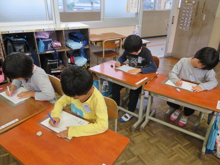 正しい鉛筆の持ち方、姿勢、1年生も頑張っています。