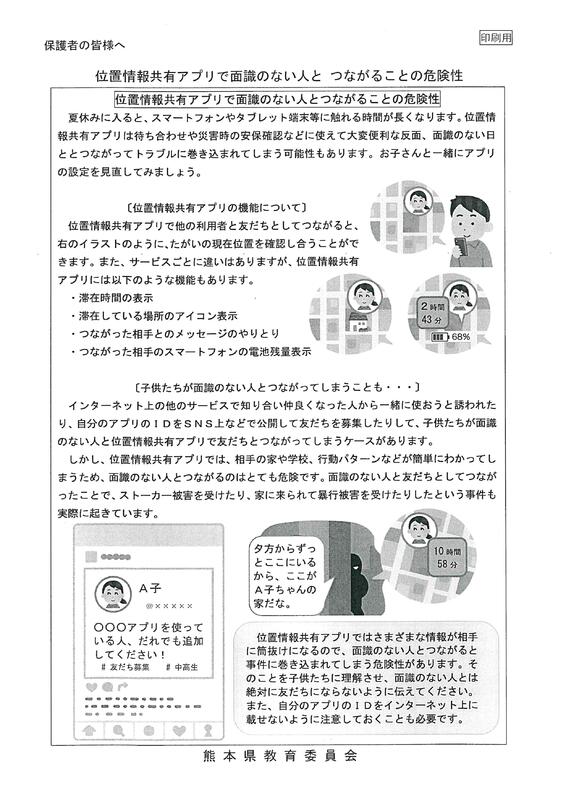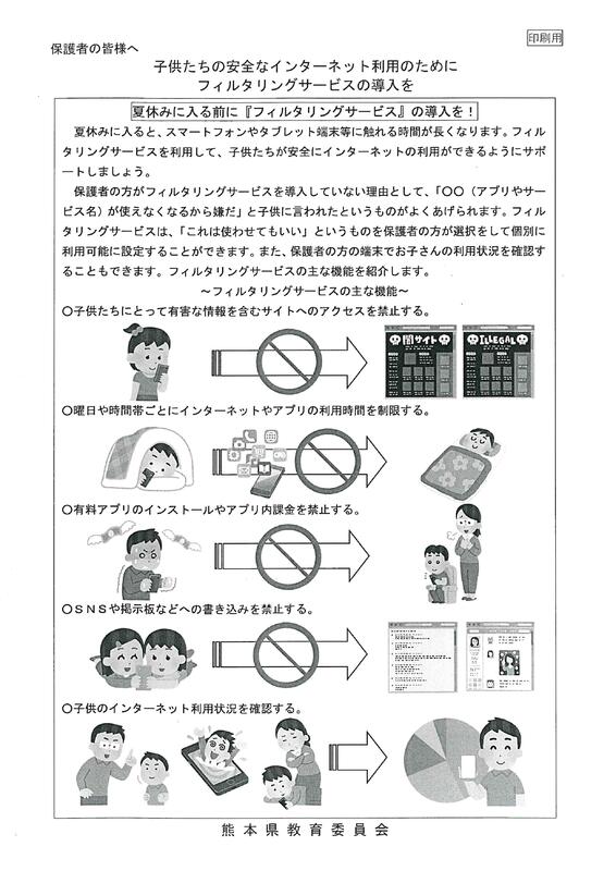 夏休みに入るとスマートフォンやタブレット端末等に触れる時間が長くなります。子どもたちが安全に活用できるようにサポートをお願いします。