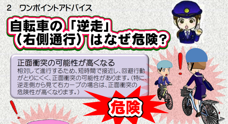 自転車の「逆走」(右側通行)は大変危険です。ご家庭でもお子さんに、逆走をせず交通ルールを守って自転車に乗るようにお話しください。