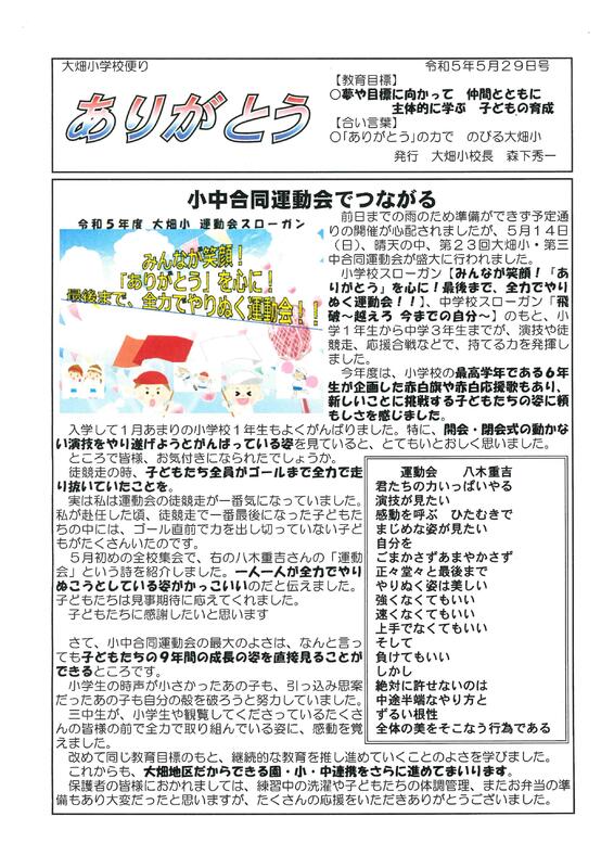 令和6年5月学校だよりを掲載しました。20240531 大畑小だよりvol.2.pdf
