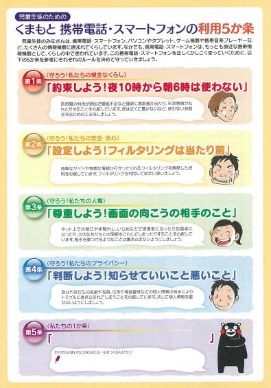 夏休みに入りました。子どもたちが携帯電話やスマートフォン等を利用する機会も増えるかもしれません。子どもたちがそれらの端末を安全に使うことができるように、それぞれのご家庭でルールを決めて使わせていただきたいと思います。下の画像は、熊本県教育委員会から出されている「くまもと 携帯電話・スマートフォンの利用5か条」です。ぜひ参考にされてください。