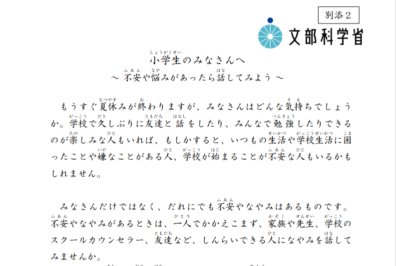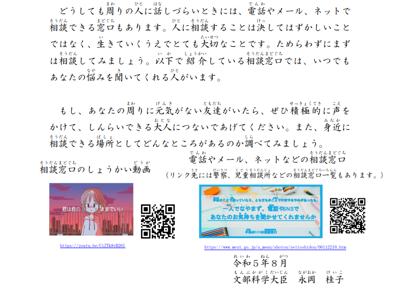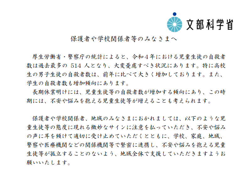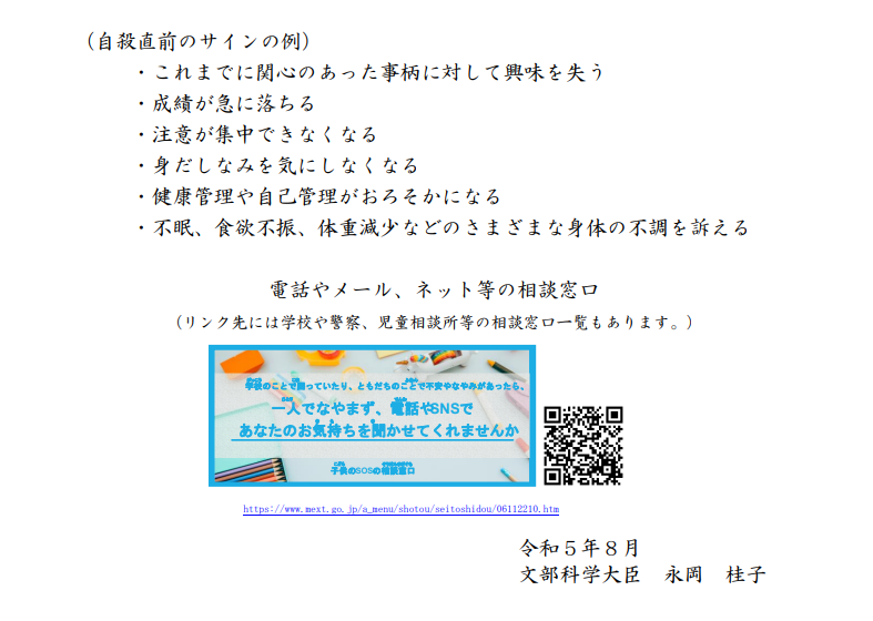 今後も引き続き、地域全体が連携して、こども・若者の自殺防止に向けた取組を推進していくとの通知がありましたので、保護者の皆様にも周知いたします。