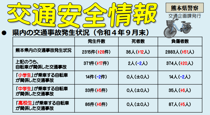 県内でも毎月自転車の事故が発生しています。引き続き「一時停止の標識を守ること」「左右を確認して横断すること」をご家庭でもお話ください。