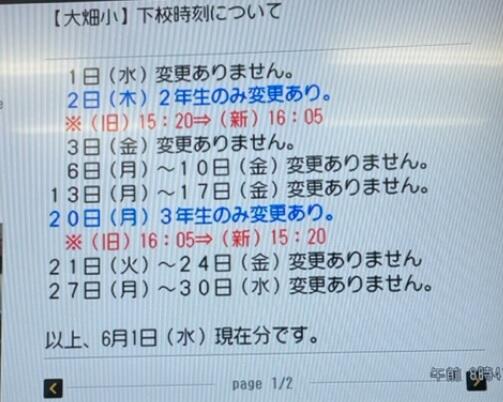 学級通信等ではその都度下校時刻についてお知らせをしていますが、災害等の理由で急に下校時刻が変更になる場合もあります。また、こども王国保安官の皆様には一月分の情報を前月にお渡ししていますが、変更も多くご迷惑をおかけする時もありました。