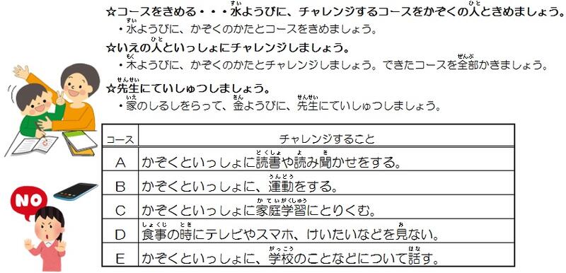 つきましては、別紙記入用シートに、親子ふれ合いの取組等についてご記入をお願いします。保護者の皆様方におかれましては大変ご多用な中とは存じますが、家庭における児童の望ましい学習・生活習慣の確立のために、どうぞご理解とご協力をお願いいたします。