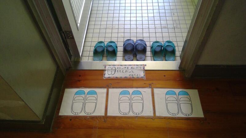 靴箱は教室のすぐ前です。靴のかかとをそろえています。
