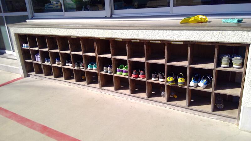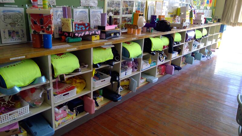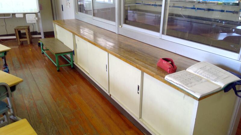 教室横の棚です。ノートを並べたり、給食の配膳台などでも使います。