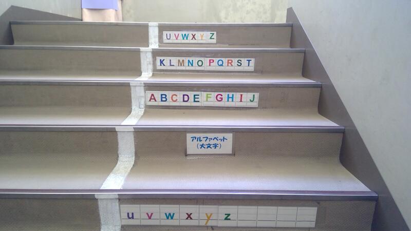 階段に英語の掲示物が貼ってるところもあります。」