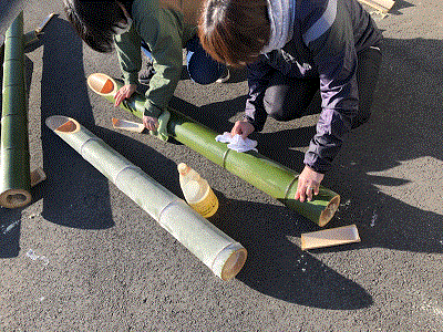 切った竹は油をつけ、きれいに磨いていきます。この作業が特に時間がかかりました。