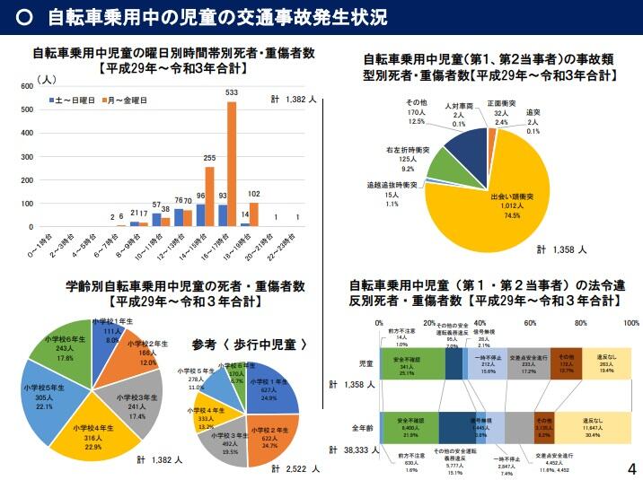 (4) 自転車乗用中の児童の死者・重傷者について、時間帯別では 16 時~17 時台が最も多く、学齢別では歩行中と比較すると中・高学年が多い。また、事故類型別では、出会い頭が7割超であり、法令違反別では、全年齢と比較して違反なしの割合が低いなどの特徴がみられます。特に新年度・新学期には、幼児・児童の環境変化に伴う事故