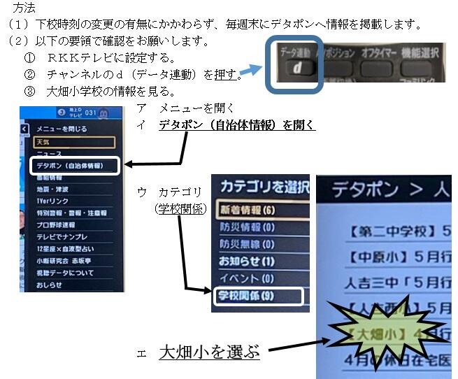 そこで、下記のとおりRKK放送のデタポンを活用し、下校時刻をお知らせするよう準備をしました。各家庭のテレビでも確認できますので、地域の方々にもお知らせすることもできるようになりました。児童の安全のために様々な手法を講じていきたいと思います。
