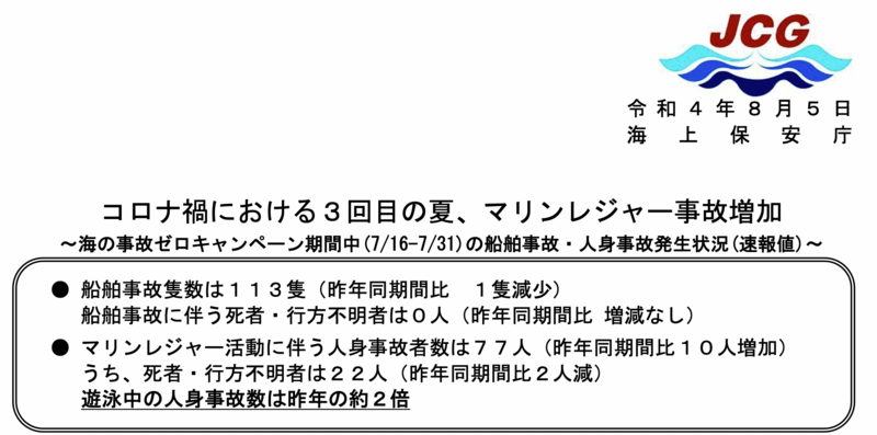 海上保安庁の発表によると、マリンレジャー活動に伴う人身事故者数は77人(昨年同期間比10人増加) うち、死者・行方不明者は22人(昨年同期間比2人減) 遊泳中の人身事故数は昨年の約2倍となっているそうです。