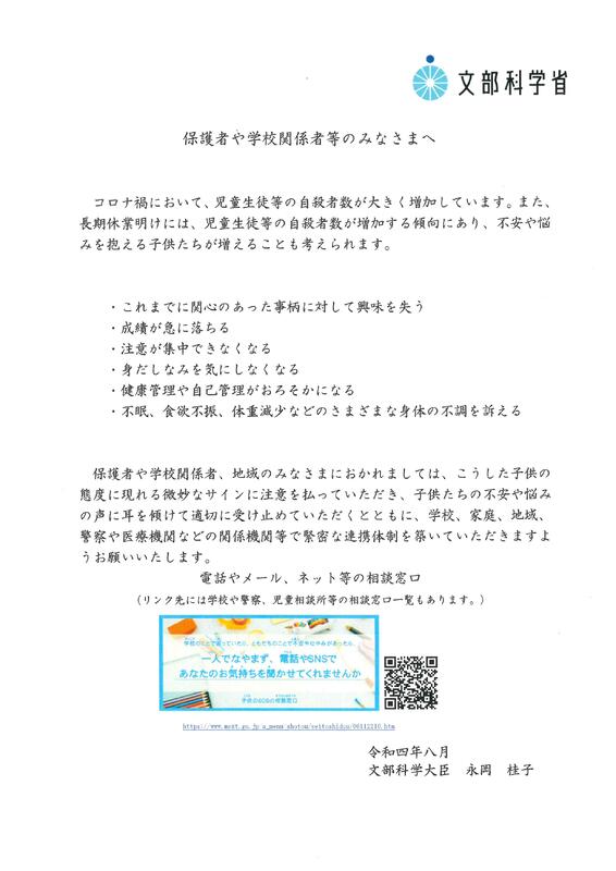 本日、文部科学大臣から、小学生の子どもたちに向けて送られてきた手紙を配付しました。保護者のみなさまや私たち学校関係者に宛てられた手紙も来ておりますので、以下に載せています。ぜひご覧になってください。