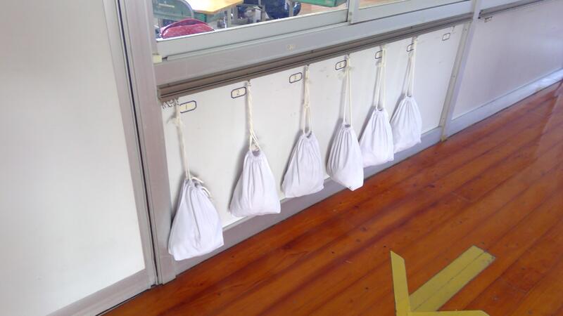 教室横の棚です。ノートを並べたり、給食の配膳台などでも使います。