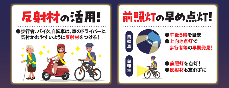 ・日没から日の出前の間に外出するときは、反射材を活用するとともに、明るい服装を心掛け、ドライバーからも目立つようにしましょう。