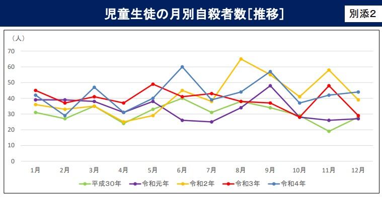 警察庁・厚生労働省の自殺統計によると、令和4年の児童生徒の 自殺者数は過去最多の 512 人(暫定値)となり、特に、男子高校生の自殺者数が前年に 比べて 38 人増加するなど、極めて憂慮すべき状況にあります。