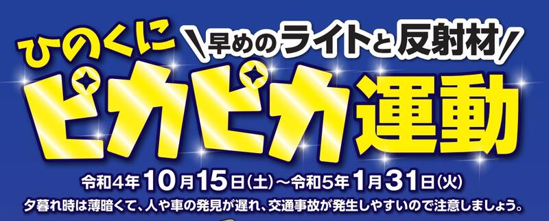 飲酒運転をはじめ交通事故等が多発しています。特に、夕方は車を運転する人からは、歩行者は見えにくくなります。お子様には、運転手の視点からの言葉かけをお願いします。熊本県警によると過去5年間の交通事故の死者287人中、10月に最多の40人が亡くなられているそうです。県警は、15日(土)に歩行者の反射材活用や車のヘッドライトの早めの点灯を促す「ひのくにピカピカ運動.pdf」を始めるとのことです。