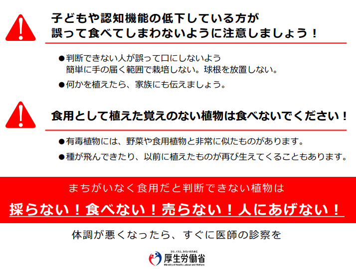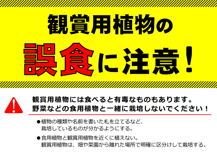 以下は、厚生労働省が作成したリーフレットです。観賞用植物の誤食による食中毒の予防をお願いします。