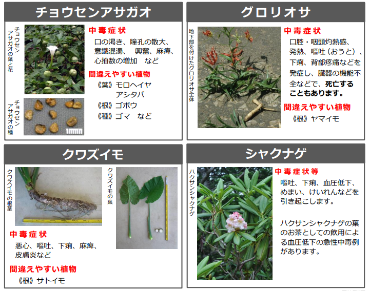 例年、山菜等と誤って採取した有毒植物による食中毒が多く発生しています。また、野草の誤食のみならず、グロリオサ、イヌサフラン等の観賞用として栽培されている植物の誤食による食中毒事例も散見され、死者も発生しています。
