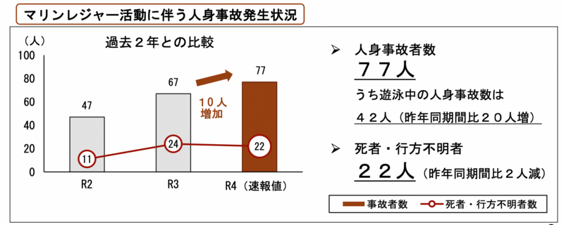 海上保安庁の発表によると、マリンレジャー活動に伴う人身事故者数は77人(昨年同期間比10人増加) うち、死者・行方不明者は22人(昨年同期間比2人減) 遊泳中の人身事故数は昨年の約2倍となっているそうです。
