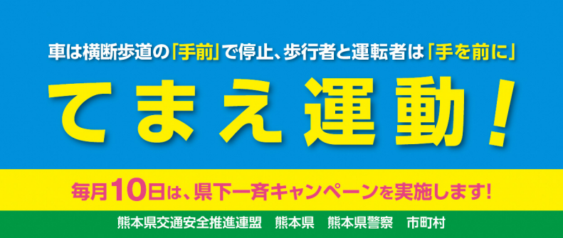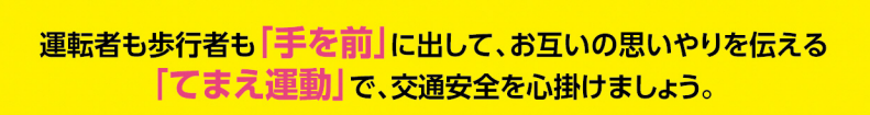 横断中の交通事故が増えています。車は横断歩道の「手前」で停止、歩行者と運転者は「手を前に」出す、『てまえ運動』を心掛けましょう。