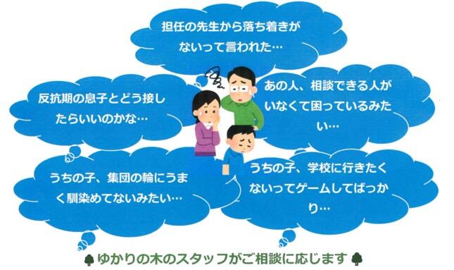 「反抗期の子どもとの接し方」「相談できる人がいなくて困っている」「子どもが学校で落ち着きがないと言われた」「子どもが集団の輪にうまく馴染めていない」など、さまざまなお悩みに、「ゆかりの木」のスタッフが相談に応じてくださいます。利用される際の依頼文や利用料がかからないそうなので、相談がしやすいかと思います。また、担当者が変わることがほとんどなく、同じ人に長い期間で支援をしてもらえるところが利点です。
