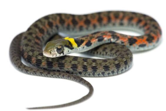 ヤマカガシは黒と赤の市松模様が特徴で、幼蛇時代には首に黄色いバンド模様が目立ち、毒ヘビらしい奇抜な模様をしています。