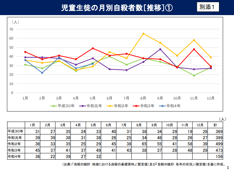 警察庁・厚生労働省の自殺統計によると,令和3年の児童生徒の自殺者数は473人であり,一昨年(499人)から減少したものの,引き続き憂慮すべき状況にあります。また,令和4年の児童生徒の自殺者数は,1月から5月までで計156人という状況にあります。