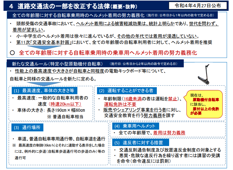 ※乗車用ヘルメットの着用については公布日から1年以内に、電動キックボード等については公布日から2年以内に施行されることとなります。